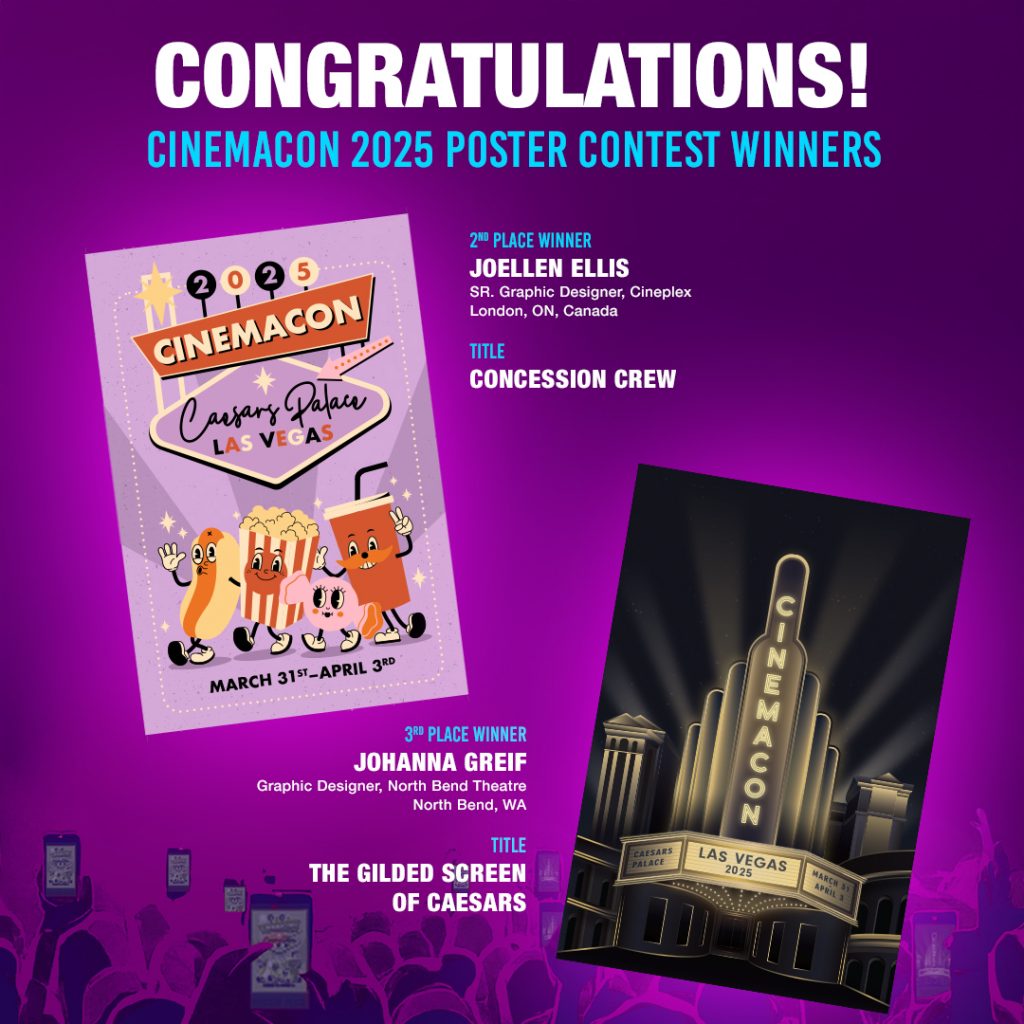 CinemaCon and Cinema United recognized the three winners of 2025’s Official Poster Art Contest, which were announced onstage Monday night in the Colosseum by Mitch Neuhauser, the managing director of CinemaCon. Sponsored by Mobile Moviegoing, the CinemaCon 2025 Art Contest was open to all theater employees of Cinema United member companies. Artists were tasked with designing a poster from one of the following three prompts: Friends’ Night Out, Architectural Wonders, and Theatre Snacks. Each winner’s artwork was judged based on their marketability, creativity, design attractiveness, adherence to the artist’s selected theme, and overall impact. All artists will receive a printed poster of their work that will be sent to them directly courtesy of CinemaCon and Cinema United.